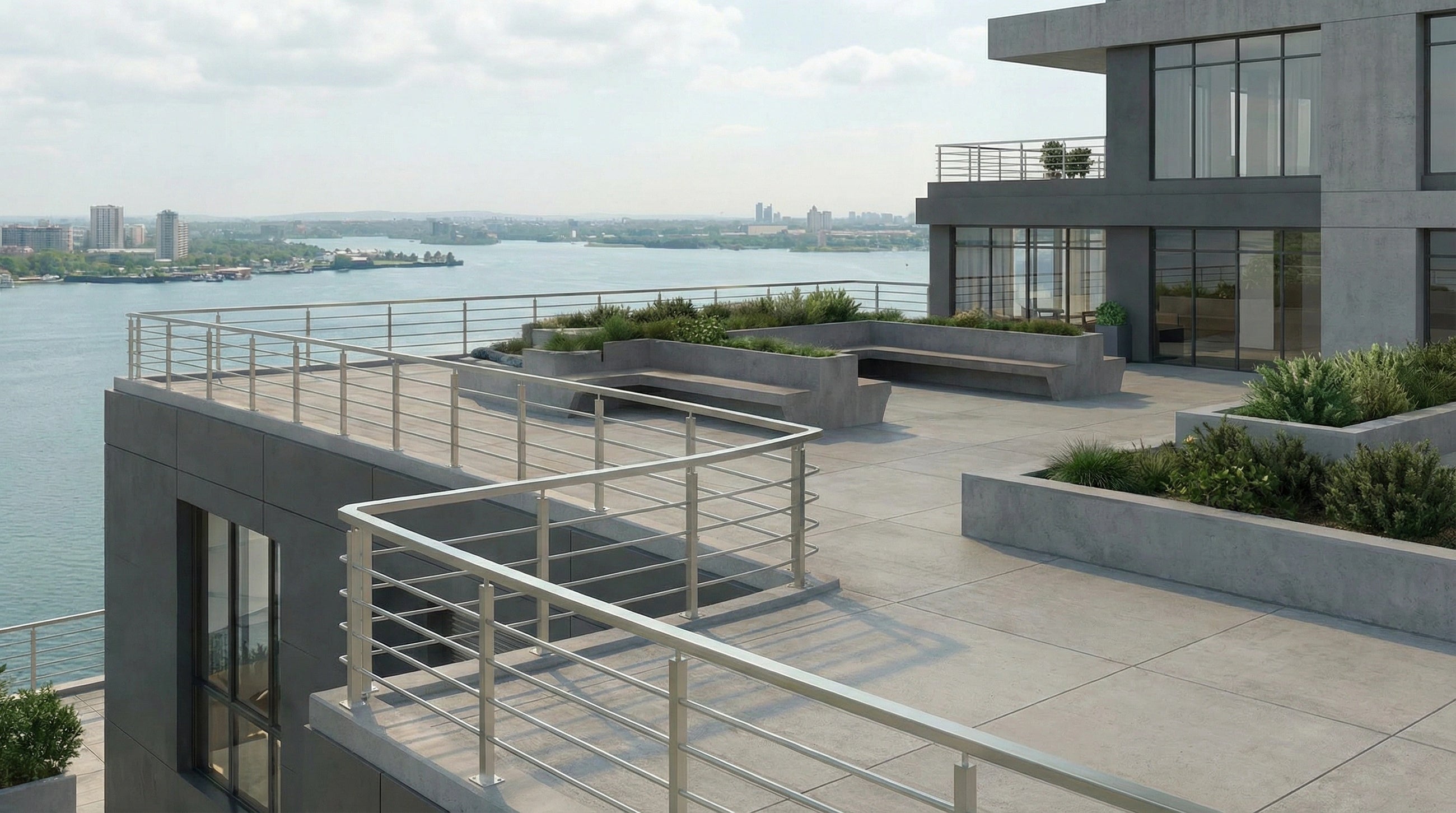 Code-compliant square-profile aluminum railing engineered for strength, clean geometry, and modern architectural continuity across stairs, balconies, and elevated walkways.