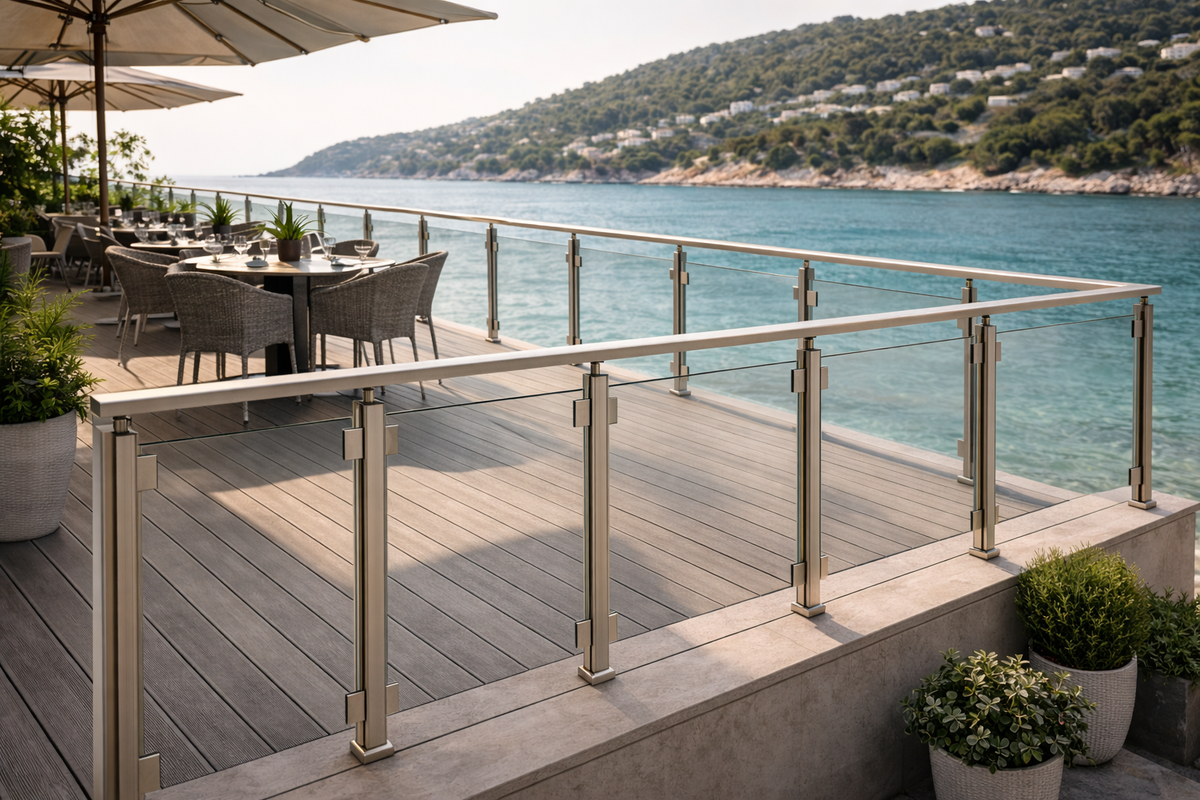 Externally mounted aluminum infill bars engineered for clean linear aesthetics, fast installation, and full IBC & ASTM guardrail compliance in modern architectural applications.